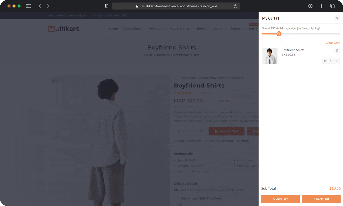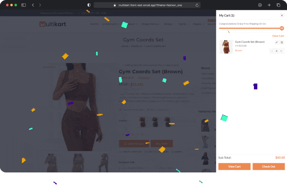 Multikart offers two cart options: a sidebar and a mini cart. The sidebar has a free shipping processbar with a distinctive animation.